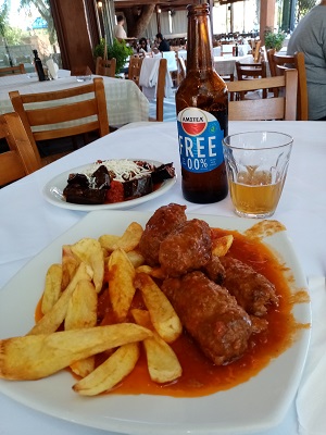 Sunday and we head into town, but it isn't very awake, so we head up north to Alcŕcer on a winding, undulating road with eucalyptus and cork either side. Lunch is pork and clams, a speciality of the region.