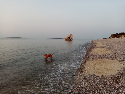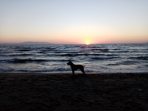 There are grey clouds overhead to we decide to head down towards Athens where the Oyster system might get a going-over next week. We park for a while on a beach where Zoa has a great time chasing small fish. But, I then notice it isn't too far to what appears to be a spectacular temple, so we drive there, arriving as the sun sets and the lights go on. Wonderful!