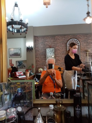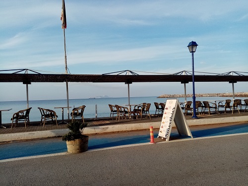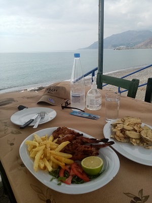 Then it's off to the Fiat Service garage to make a very significant donation to their annual turnover. Oil, oil filter, 2 x brake shoes and (sadl) also 2 x shockabsorbers - front. Still they do a good job and repaint both mirrors and both windscreen washers so hey look like new. Then off to Stavros - a place with a quiet atmosphere, even when the wind off the sea is doing its thing.
